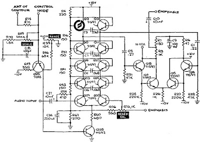 The left 2/3 is what is common with all Moog synthesizers (exception the anemic and weezy Satellite and Minitmoog preset synths). The ladder topology is the set of five transistor pairs in the center. The bottom pair is the differential current driver, while the remaining pairs are the four filter stages yielding the 4-pole/24dB cutoff slope (the four caps between the emitters is performing the filtering).