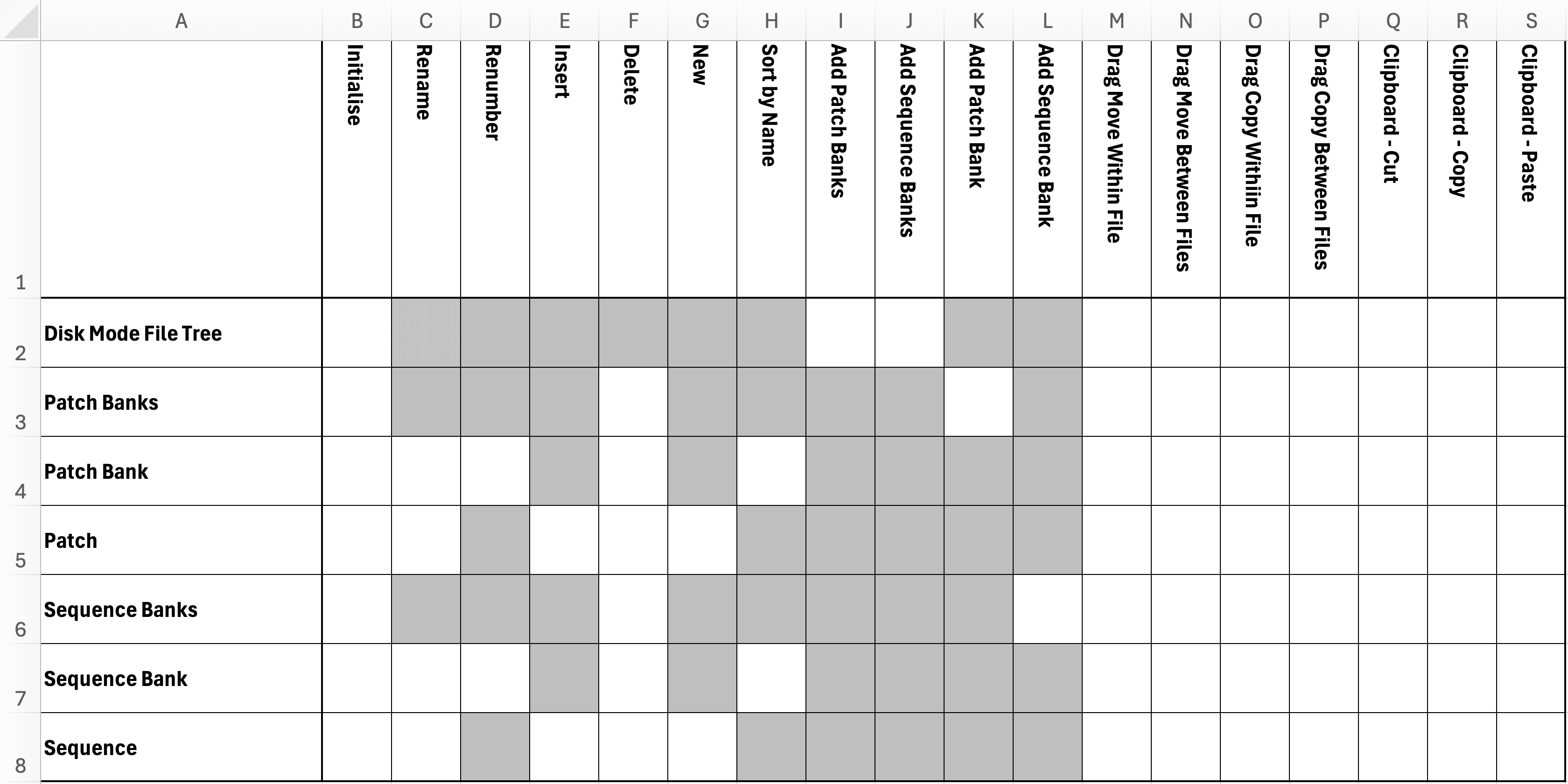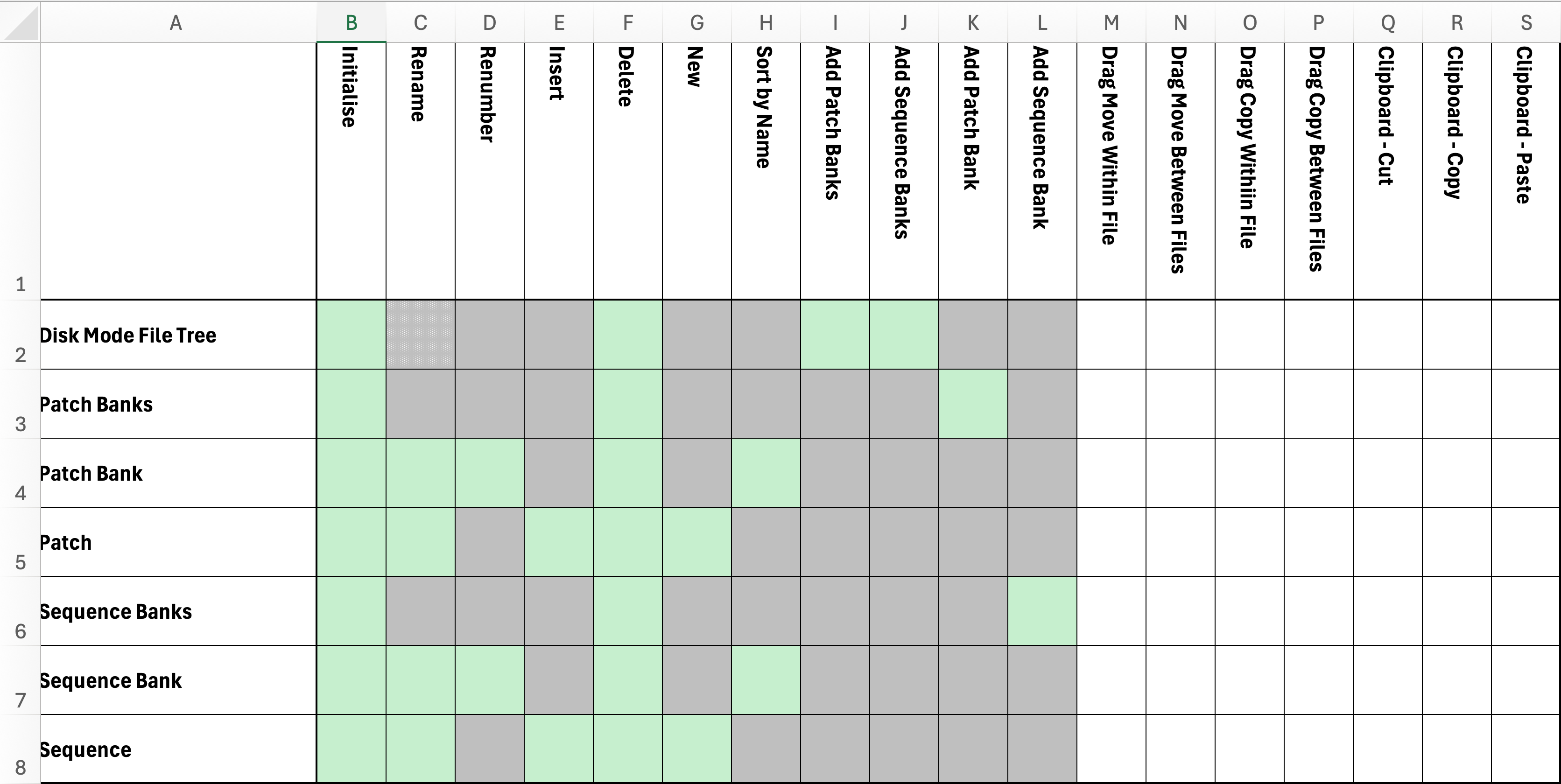 I have created my Test Sheet check-list, ready to run through testing of menu actions and drag and drop actions. This sheet gives you an idea of the features available. The grey cells indicate were features are not available for certain objects. E.g. you can rename banks and patches/sequences, but not the main tree branches.