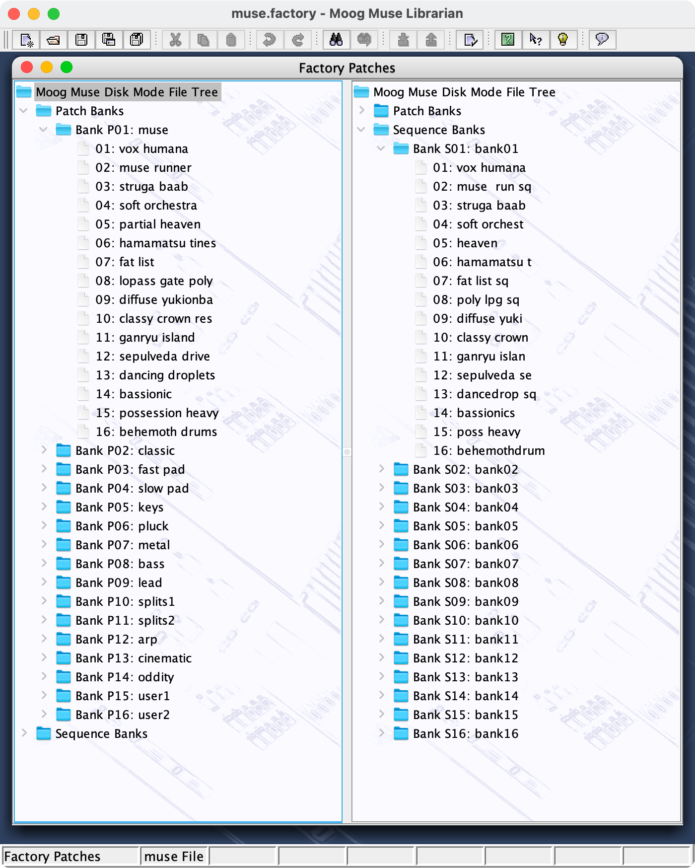 Below you can see a tree view of the Moog Factory Patches, in a split view with one side expanded to show Patches in Bank 1 and one side expanded to show Sequences in Bank 1.