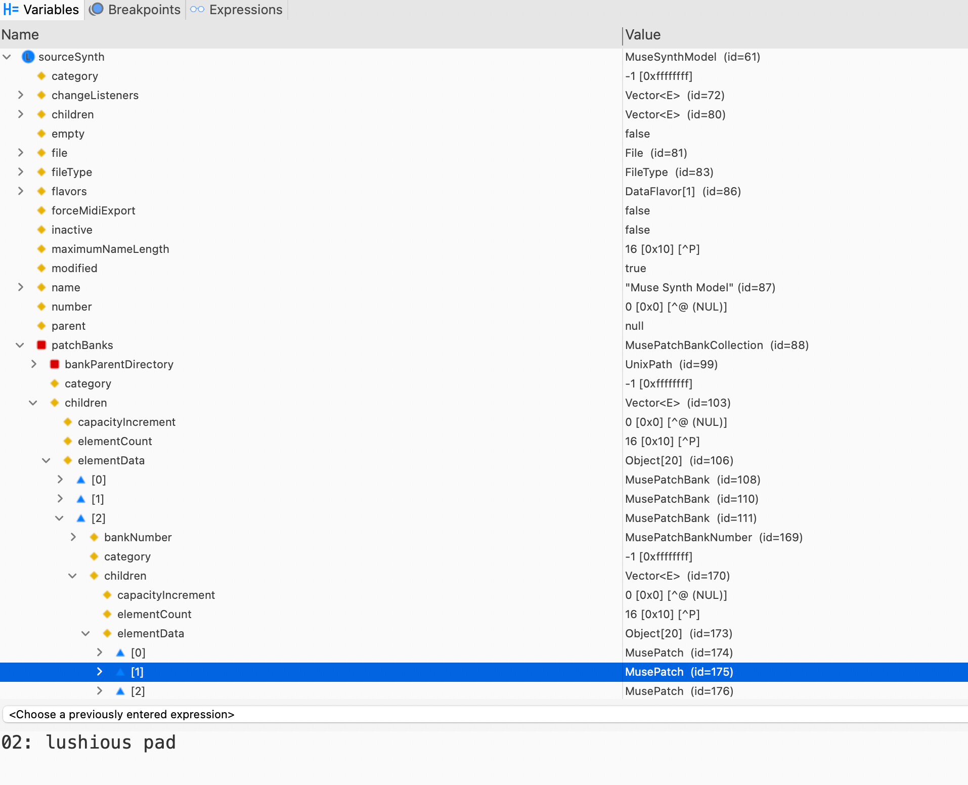 The MuseSynthModel, which is my container for the Muse file tree contents, and in this case it is showing the factory contents. All of my librarians have an equivalent SynthModel relevant for the synth in question.