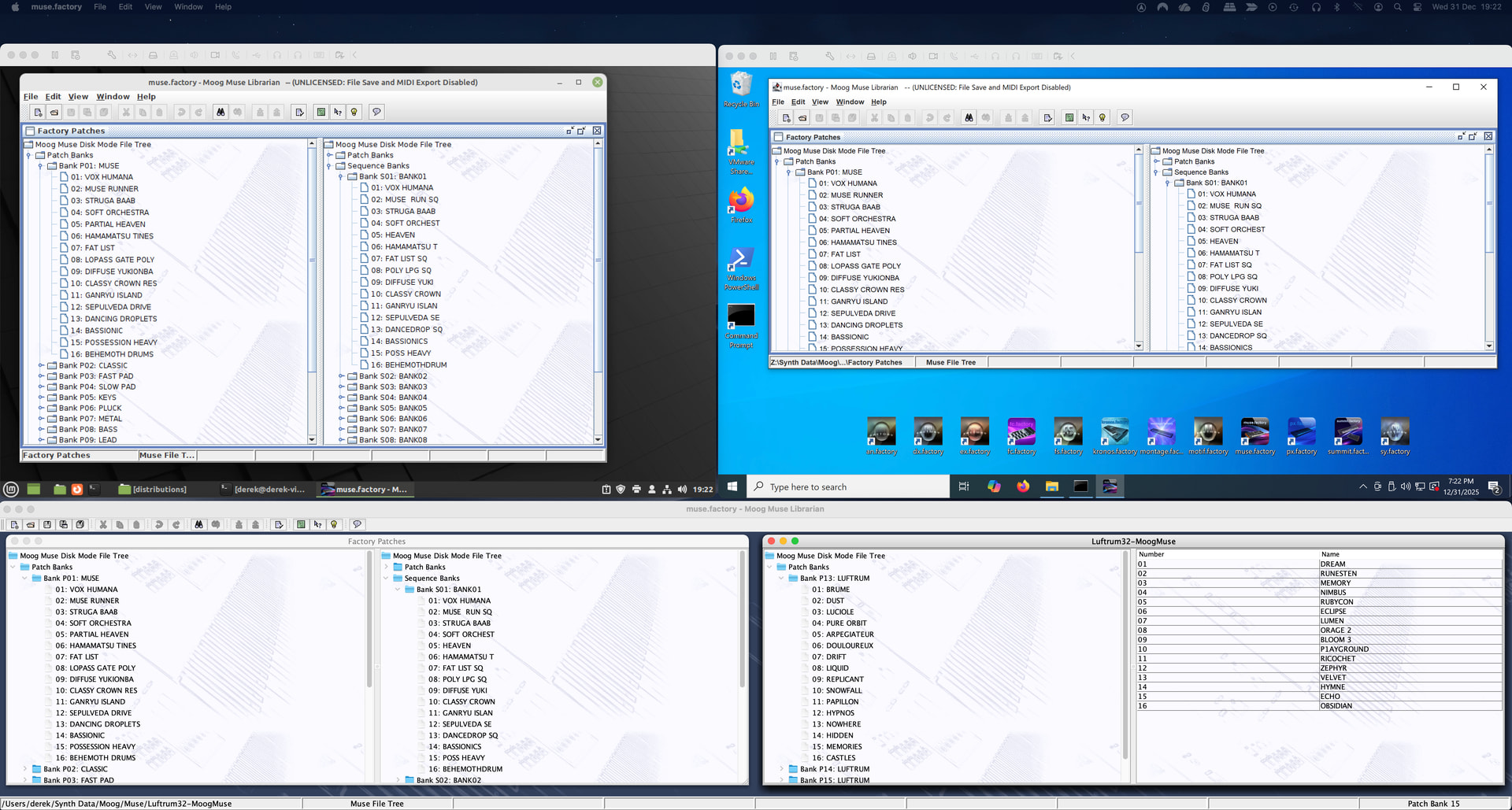 And I have created the Workspace for testing. A Workspace is a snapshot of open files and how they are displayed, which is a huge bonus when you are doing things like testing and other activities where you want the same files open with a specific arrangement, and be able to get back to that repeatedly! So below, I have the factory set, the Luftrum 3rd party set and two files specifically created in muse.factory (a way of testing the New feature!), with one that has a Patches/Sequences created and the other is completely empty.
