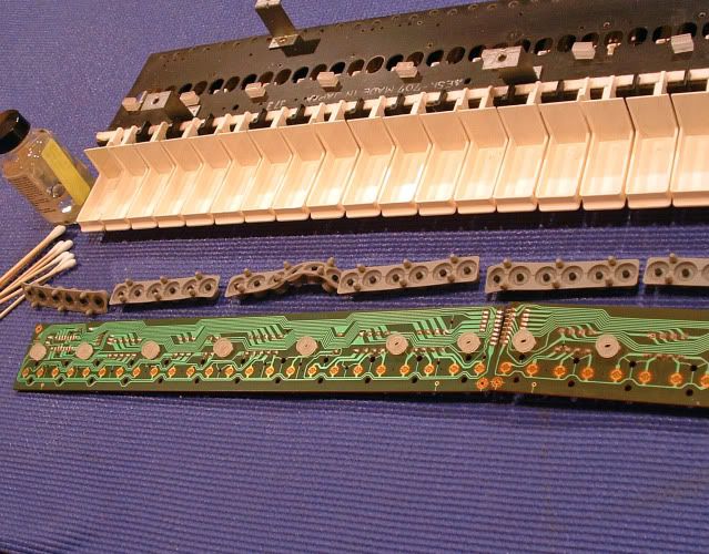 I’ve read that some of the early units shipped with j-wire keyboards, and the later ones had the rubber-plunger contact-strip keyboards. Mine is rev A8 with the latter. Here’s a shot of a spare keybed that I refurbished and sold recently - identical to the type currently in my OB-8: