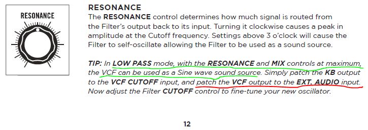 Here is how I patched it according to the manual, resulting in silence as just described: And here is how the Sine wave plays as it was probably intended (and works also without the KB to VCF Cutoff, then the pitch is only controlled by the cutoff itself without keyboard follow): So, that's all about the "magic" that I didn't seem to catch yesterday... at least I hope I got it right now