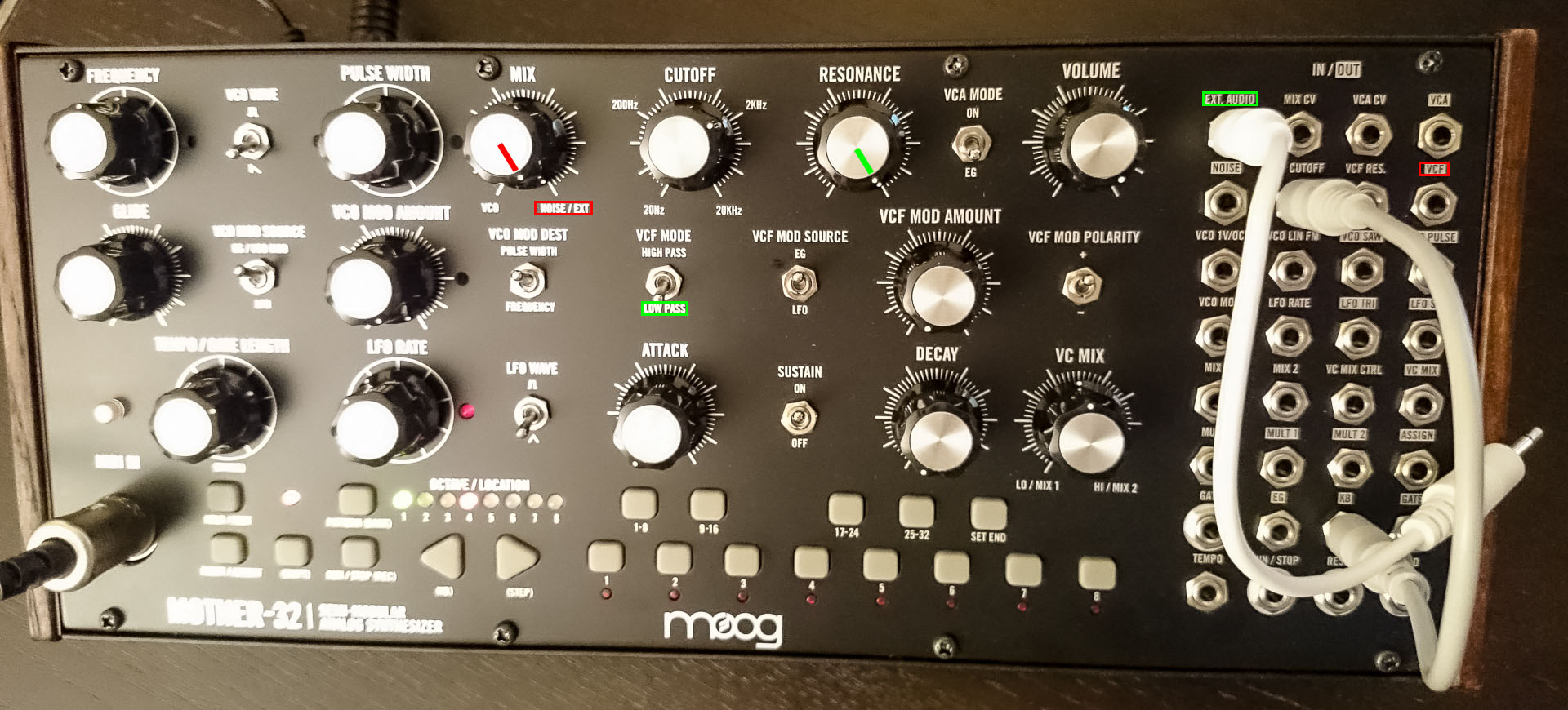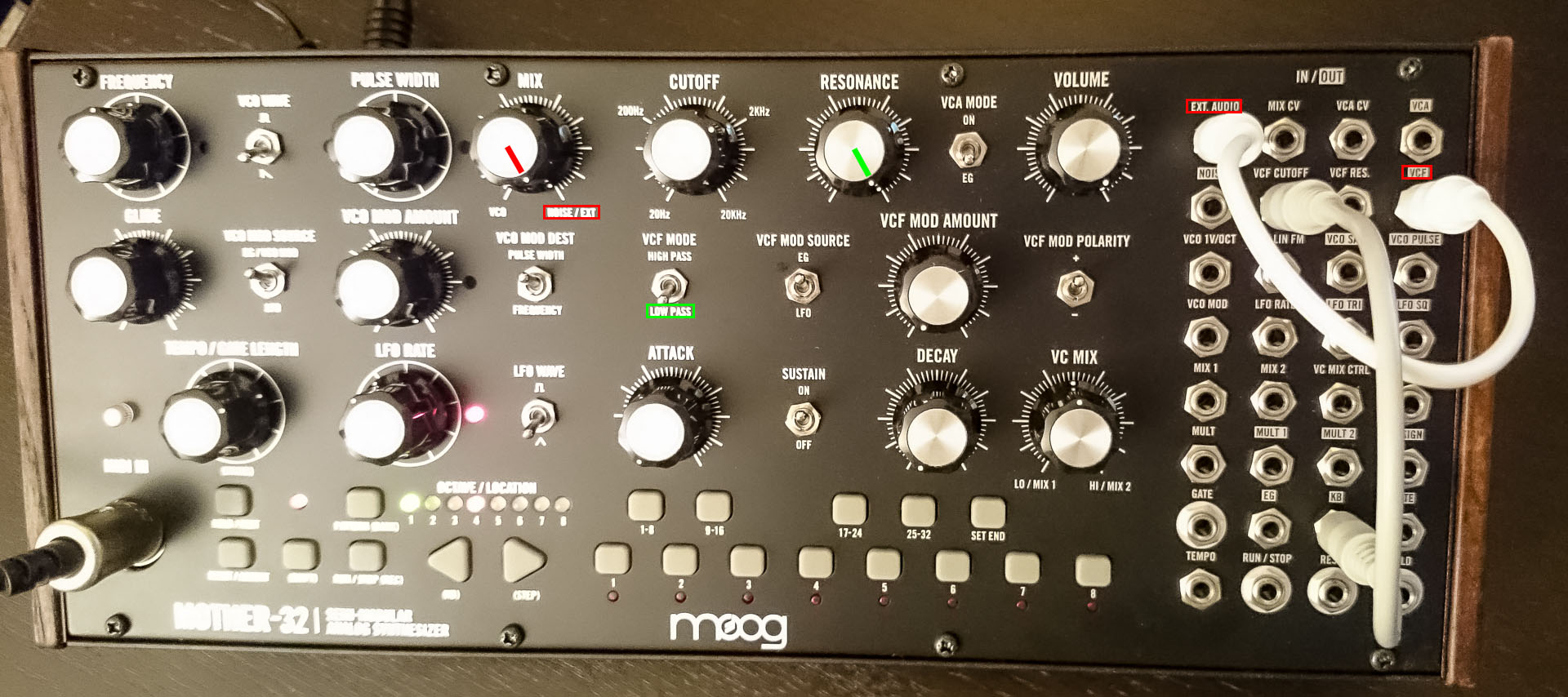 And believe me, I'm eager to get that sound to work with the VCF OUT plugged in, because thanks to you guys I understood by now that the VCF OUT should be driven by self-oscillation of the filter, creating that nice Sine wave sound, and it must be connected to be able to mix it back with the Pulse (or Saw) Wave as you do.