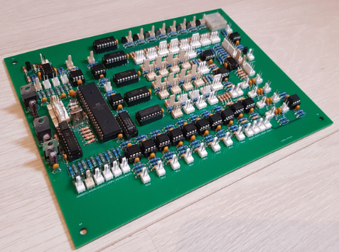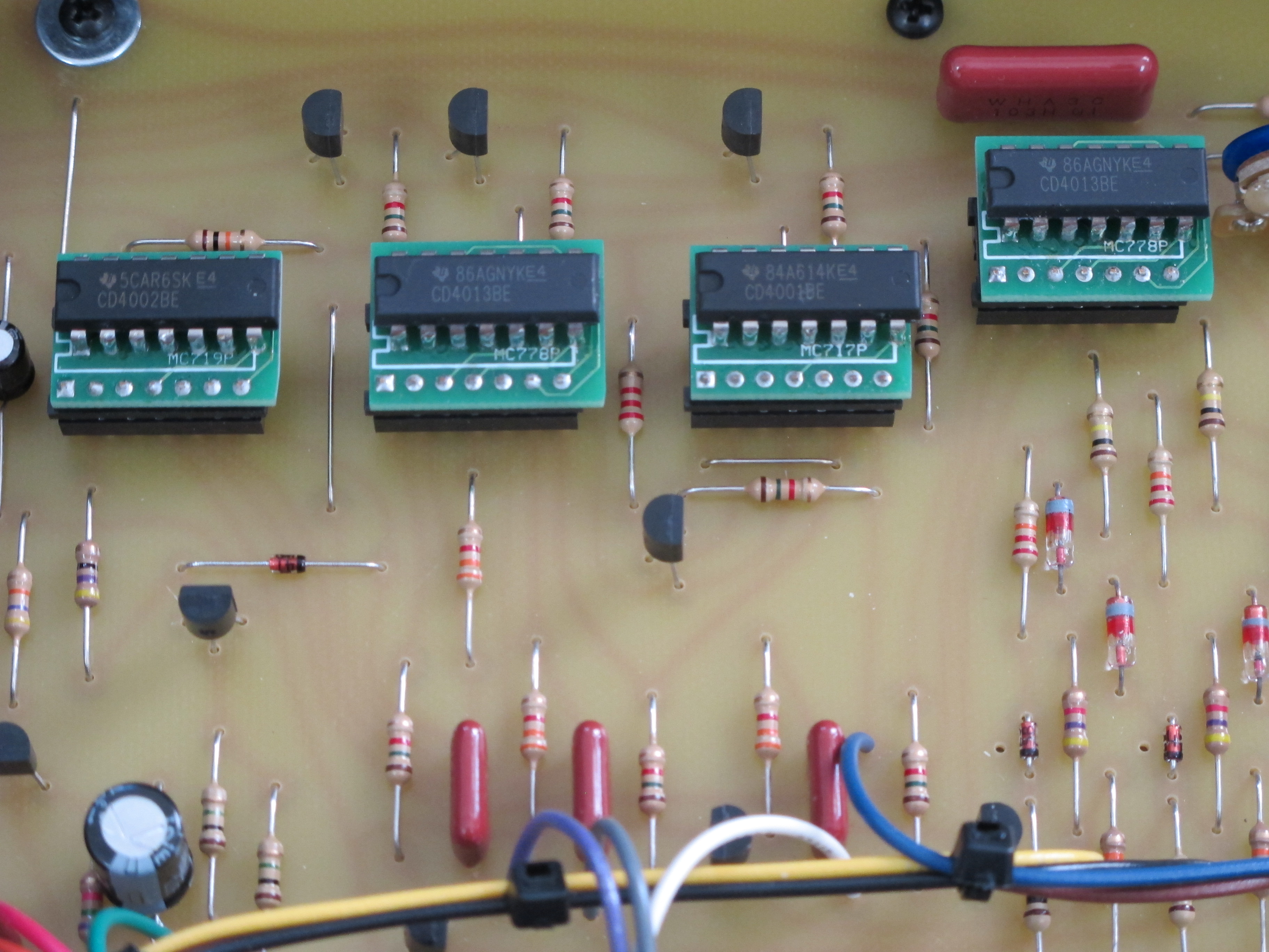Before receiving the 960 I had wondered what Moog had done about the long obsolete RTL logic chips that were used in the original 1960s design. I remember reading about how Gene Stopp had scrounged around to find enough RTL chips for the building of the Emerson modular clones in 2014 and I was curious if Moog had continued to use RTL in the current products but I was glad to see that they didn't do so. The main logic board in the 960 has been completely redesigned using 4000 series CMOS running at 5 volts supplied by a 7805 voltage regulator. This is exactly what I would have done had I been in charge of this product at Moog. The 961 and 962 were done differently though, the original PCB layouts were reused without modification, 4000 series CMOS was again used but the different pinouts were accommodated by the use of small daughter boards that each held a CMOS chip and in turn plugged into the socket where the RTL chip would have been. I'm not sure why this was done, it would seem to me that altering the original board layouts for CMOS pinouts wouldn't have been any more difficult than making a bunch of daughter boards but that's what they did.