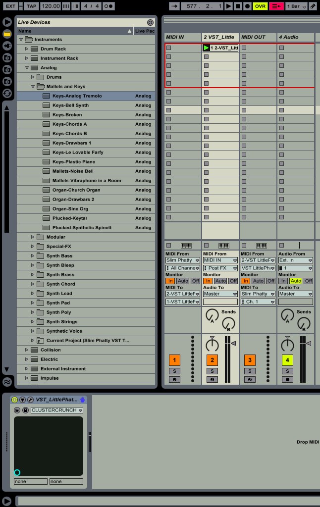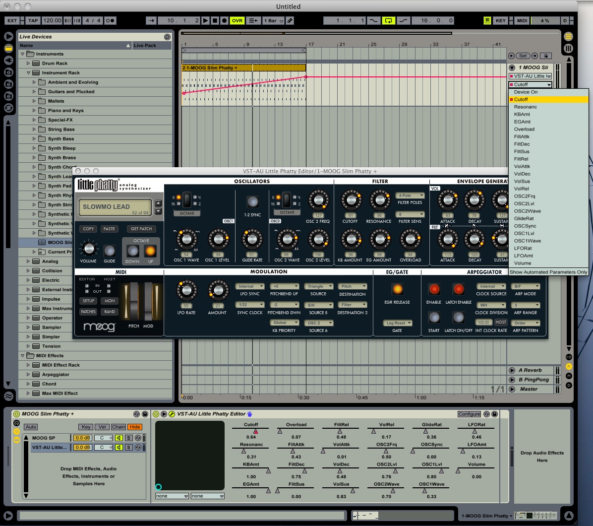 TIP :!: : The best way to set up the VST/AU Little/Slim Phatty in Ableton Live is to create a MIDI channel, then create an INSTRUMENT RACK, then throw in both the EXTERNAL INSTRUMENT TOOL and the VST/AU Little/Slim Phatty EDITOR inside the INSTRUMENT RACK you just created... to get the parameters you need to show up on the on the VST/AU Plug-in signal chain (at the bottom of your screen), click on the "Configure" button and just click and wiggle on the VST/AU Plug-in window the parameters you want/need, these will then be configured and will show up as a fader on your VST/AU Plug-in signal chain (at the bottom of your screen) and be ready to be automated on your arrange view window.