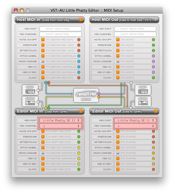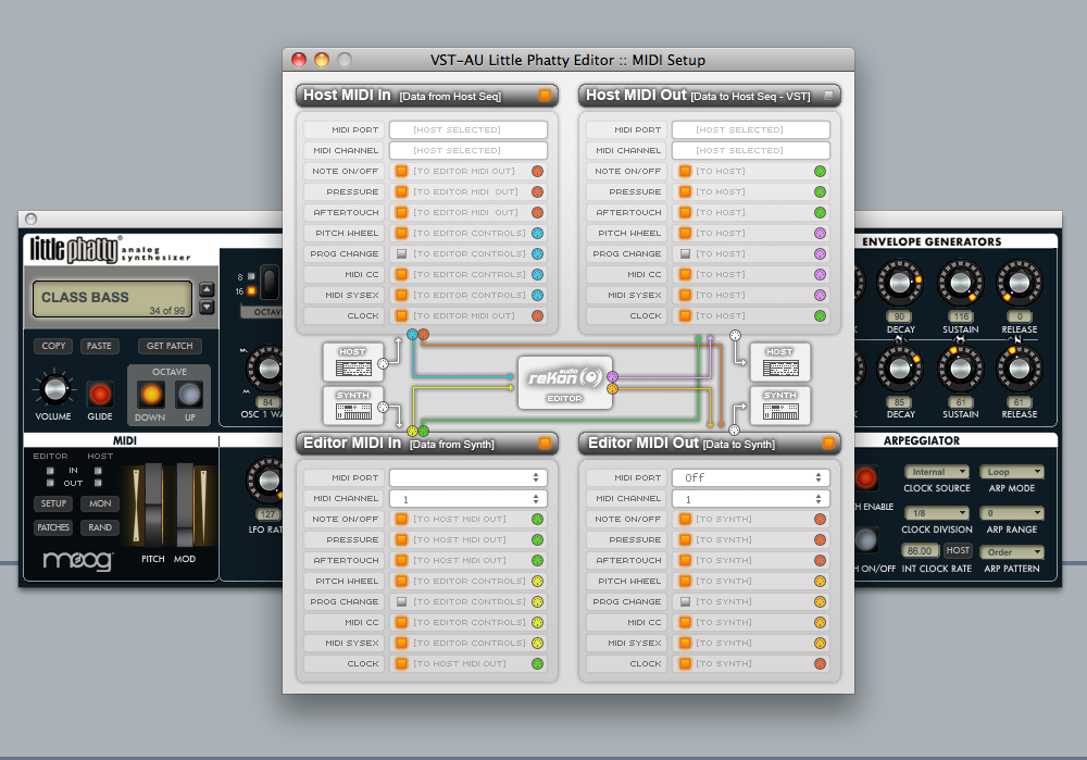 Rekonaudio's support regarding the midi set up inside Live for their VST Editor has been pretty much useless so far, I guess I will continue to bother them until they give me exact details as to how to MIDI set up this damn editor.. If anyone has figured out the set up for Ableton Live PLEASE, PLEASE take a nice and clear screenshot of the three MIDI channels and one AUDIO chanel needed (as per Rekonaudio) and post it to this thread.. I'm sure a lot of users would really appreciate it. I'm so disappointed with both Moog Music and Rekonaudio for not having some sort of CLEAR MIDI set up manual for this Little/Slim Phatty VST Plug-in for major DAWs (In my case Ableton Live)