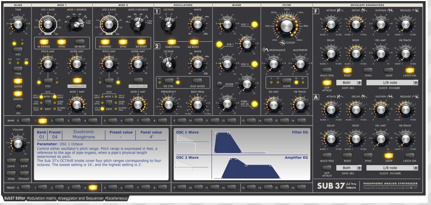 I found this. Read It. Read it again and Understood what is written here.bernard wrote: Besides the editor, the often mentioned and important features like displaying parameters and a useful method of naming the presets are ignored. I suggested a suitable way months ago: Use the keys for choosing letters. There are 37 keys that could represent the 26 letters and the 10 numbers. Associating a letter with a key is really easy to learn and remember, pressing a key twice could switch between lower and upper case. But there wasn't a response from Moog yet.