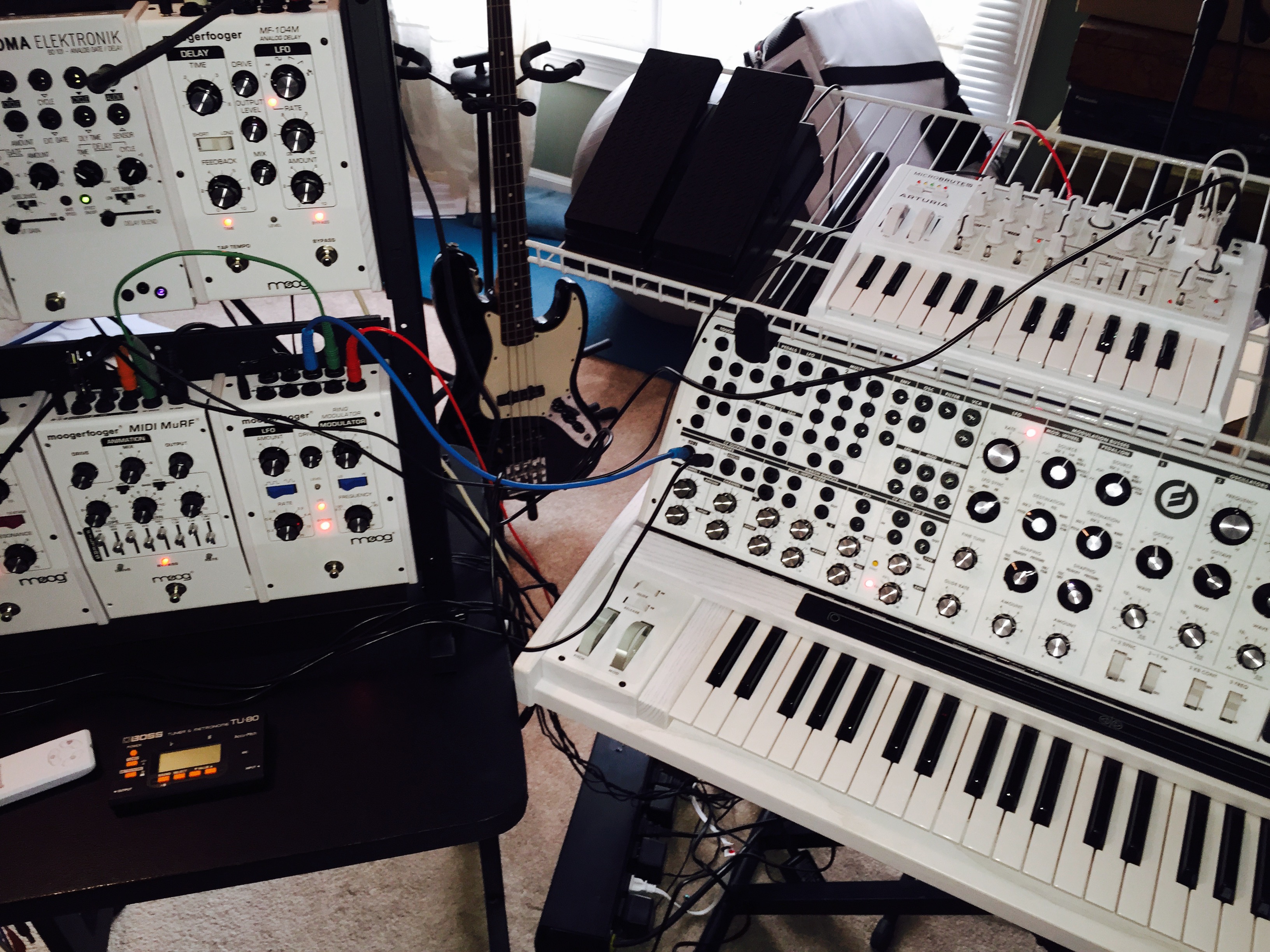 White Voyager XL, 2xM32s, Theremini, 7xMoogerfoogers, NordLead2, Access Indigo2, Eventide Space, Alesis Wedge