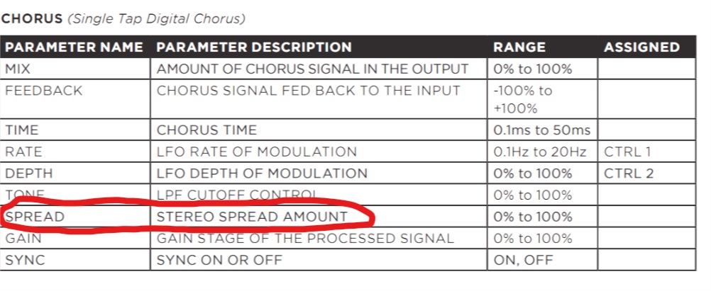 Additionally - and this is telling - the docs talk about there being a "stereo width" parameter for all the modulation effects. But, no parameter exists in any of the effect algorithms...!
