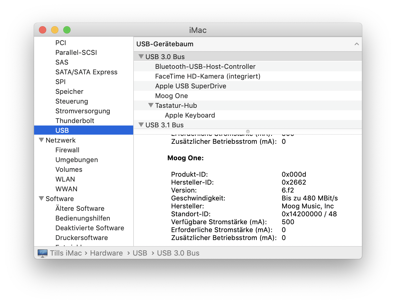 Screenshot of the USB connected Moog One (on my iMac running the german MacOSX version 10.14.5 beta)