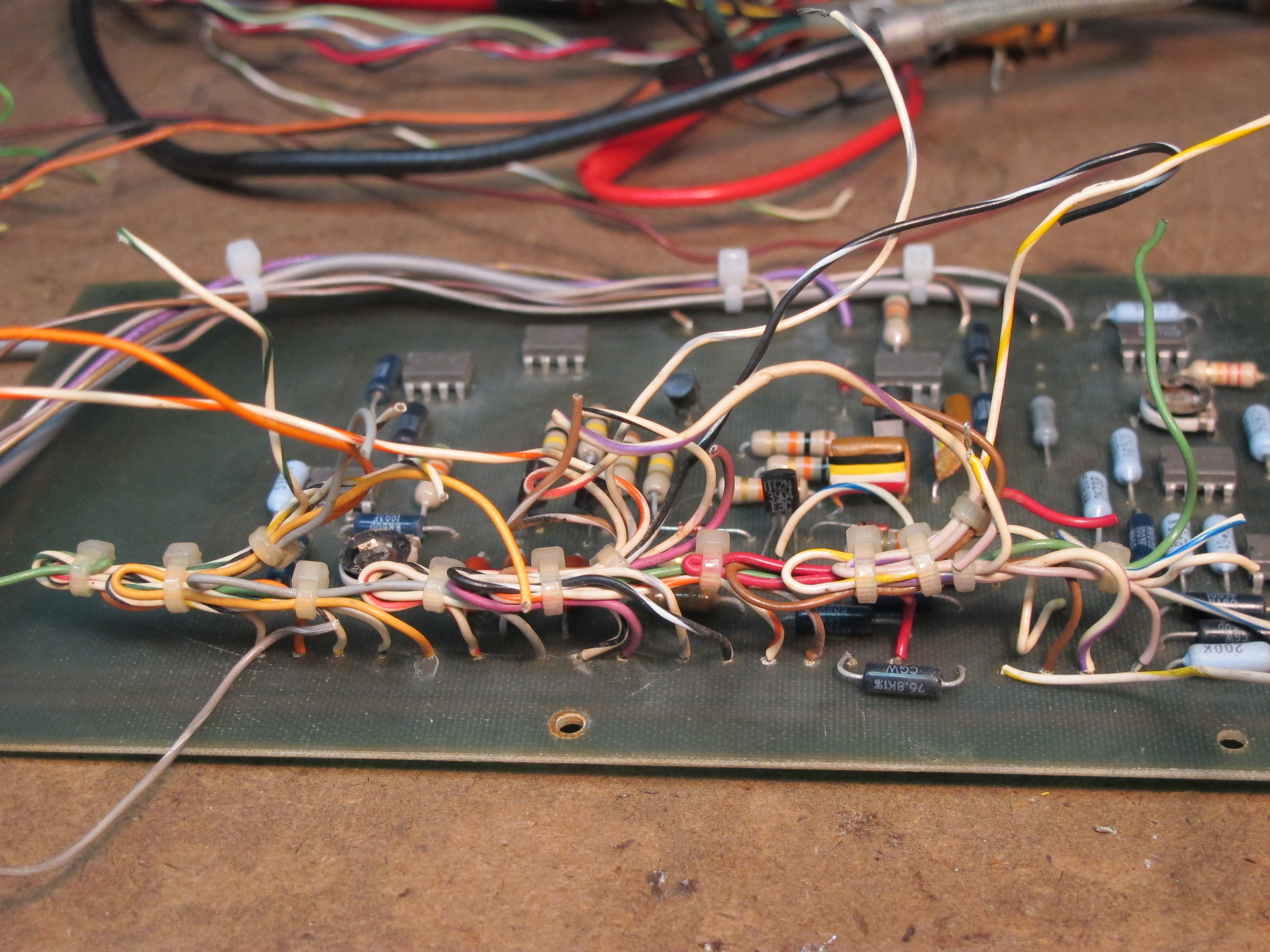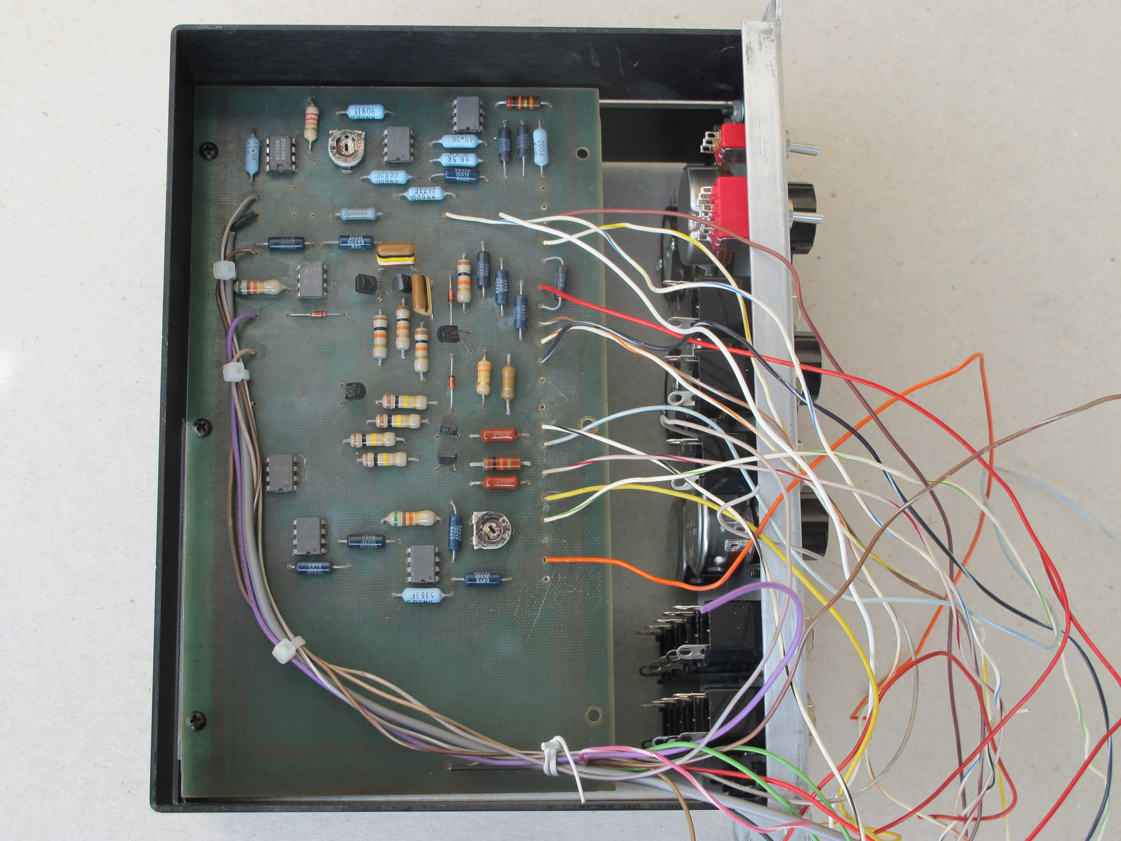 Both circuit boards looked like they were in good shape despite being nearly 50 years old. They needed some major cleaning though. The 91-123 board had all of the wiring chopped off with only about 2" - 3" remaining which was way too short to reuse. The 91-125B board had all wiring removed and was also missing an E112 FET. The first step was to replace all of the wiring on both boards and replace the missing FET. This required running about 50 new color coded wires between each board and from each board to the front panel and took about two full days of work. There was additional wiring between various jacks, pots, and switches on the front panel itself. I was able to duplicate the original color coding with only 4 substitutions for wire color coding that I didn't have. I didn't have another 921 to just copy so I had to rely on the schematic and a few photos found on the internet to make all fo the connections.